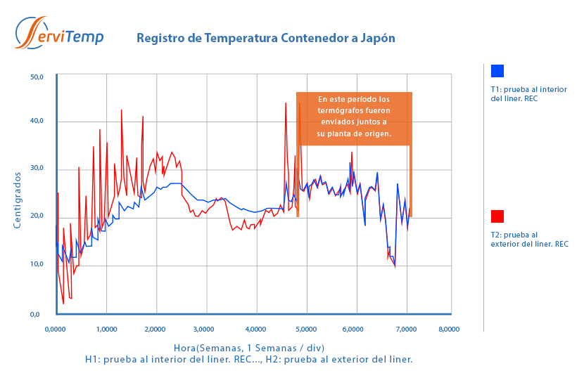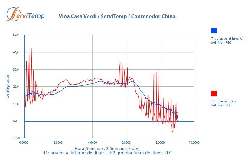 Prueba de temperatura En la siguientes pruebas, a través de gráficos, demostramos la efectividad del Linerbag. Enviamos 2 termógrafos en un container, uno fuera y otro dentro del LinerBag: El tramo Rojo (afuera) registra fluctuaciones bruscas y extremas de temperatura, además de quedar expuesto a la humedad. En cambio, el registro de color Azúl (dentro), demuestra una temperatura muy estable, sin fluctuaciones bruscas. Adicionalmente, protege el producto de humedad, manteniendo su presentación. Clic aquí para ver más Descarga los comprobantes y certificados. Especificaciones Linerbag Informe USACH 01 Especificaciones Bolsa Estiba